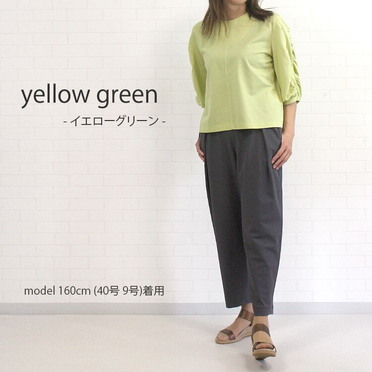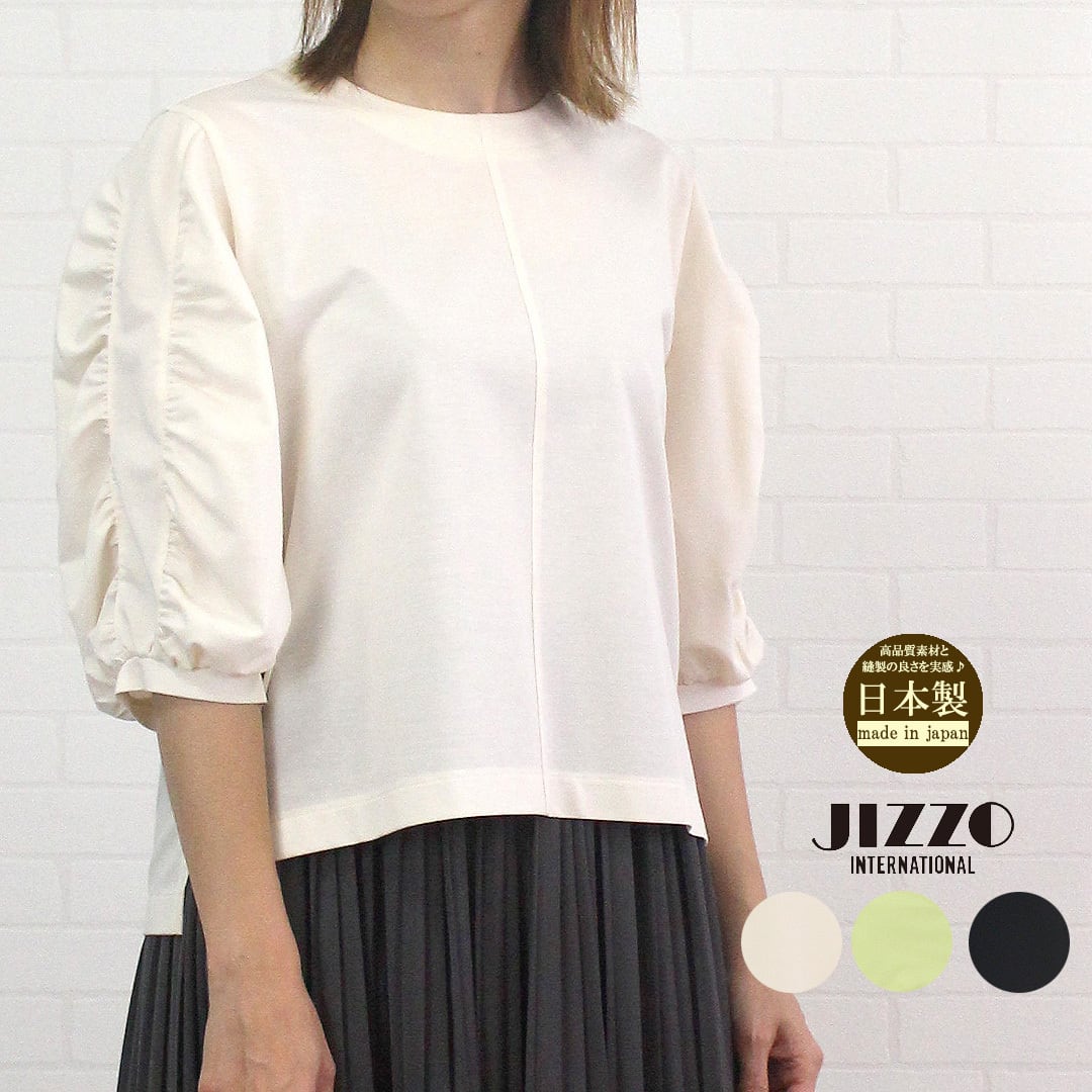 シャーリング袖が女性らしい日本製7分袖カットソープルオーバー ジッツォ JIZZO JKGC40 トップス ノーカラー 涼しい 初夏 夏 初秋 レディース 女性 シンプル 綿