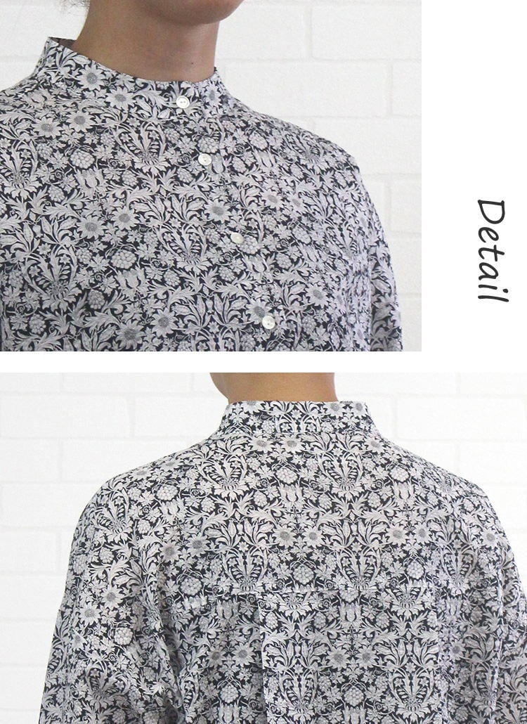 LIBERTY 25ss限定企画のイーストボーンローンは表面に凹凸があるので肌離れも良く、さらりとした肌触りの夏に適した素材です。あえて濃色の落ち着いた柄を選び長袖にすることでまだ暑い秋の立ち上がりにぴったりなブラウスになっています。羽織としても使いやすく便利なアイテムに仕上がりました♪