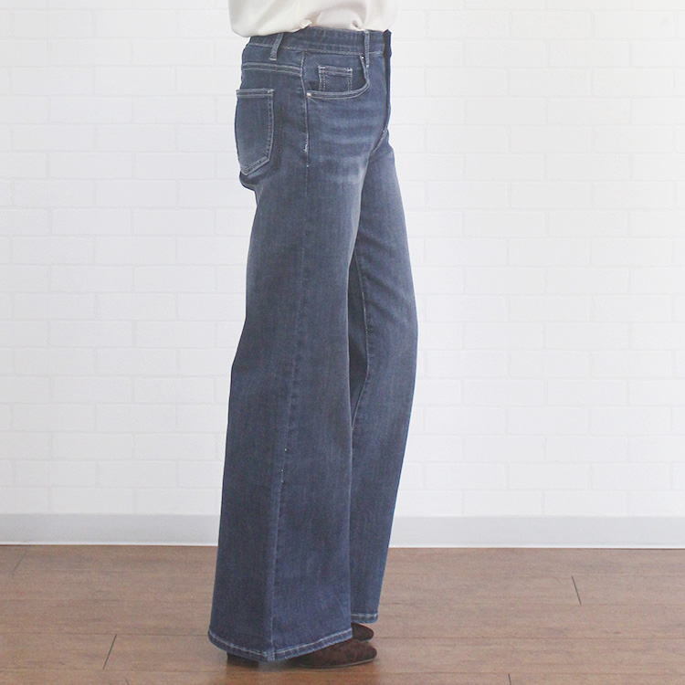 ヒップポケットのデザインが特徴的な、INDIMARK(インディマーク)大人気のニューワイドデニムに新色:ベーシックブルーが登場!ウエスト裏面ゴムと抜群のストレッチ効果の高い生地は、デニムでありながら穿いていることを忘れるくらい快適♪やや深さのある股上に、足のラインを拾わない程良くワイドなシルエットは美脚&脚長効果抜群!カジュアルなトップスはもちろん、キレイめアイテムとも好相性な着回し力抜群の1本です。