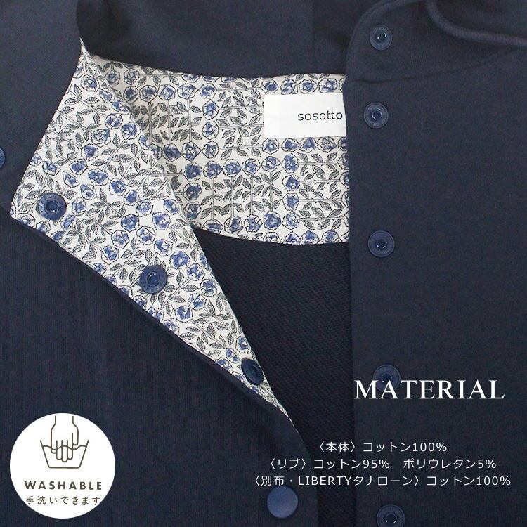 〈本体〉コットン100% 〈リブ〉コットン95% ポリウレタン5% 〈別布・リバティ タナローン〉コットン100%