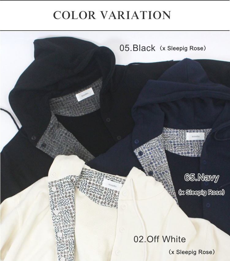 やわらかなコットンの裏毛とsosotto別注カラーのSleeping Rose(LIBERTY PRINT)を組み合わせたさりげないおしゃれ感に心躍るsosottoのフードジャケットご紹介です。アウターとして便利なスナップ釦の前開きフードジャケットは、見返しのLIBERTY PRINTが羽織った際にチラリと見え、女性らしい可愛さをプラスしてくれます♪