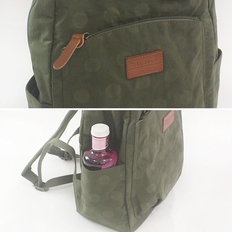 デイリーに使える落ち着いた大人のバッグを提案するtoleur(トーラ)より、人気のドット柄シリーズのリュックサックがリニューアルして新登場!以前よりもひと回り程サイズダウンしすっきりとしたデザインに。軽いナイロン地に熱加工でドットプリントを施した愛らしいバックパックはダブルジップファスナーで開閉しやすく、使い勝手抜群。もちろん、充実の内ポケット、外ポケットは健在。今回も320gという驚きの軽量さをキープしています!通勤・通学はもちろん、休日のお出掛けまで大活躍の予感です♪