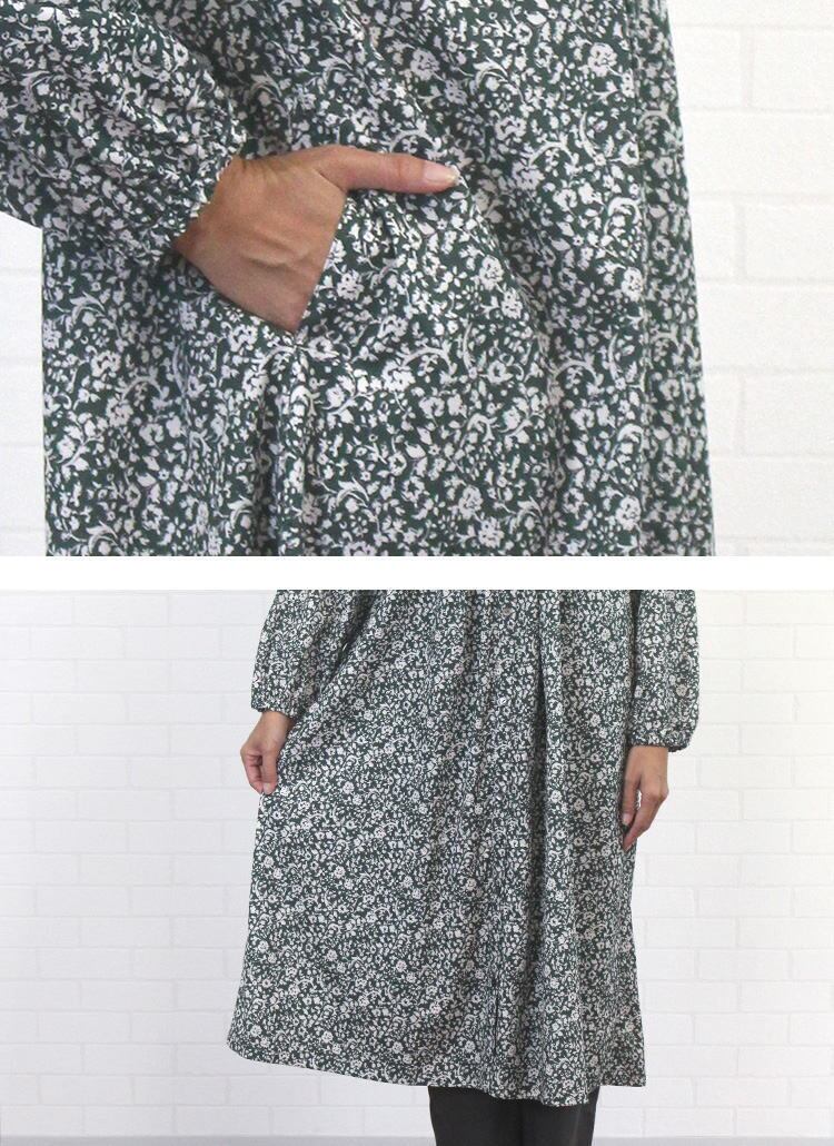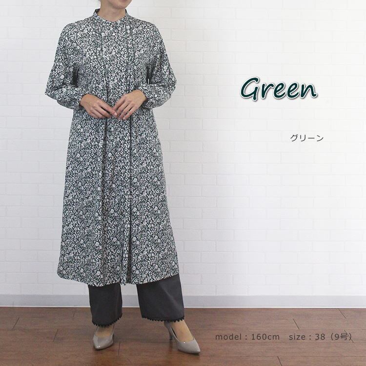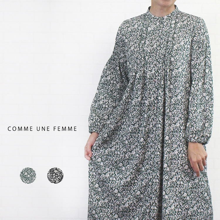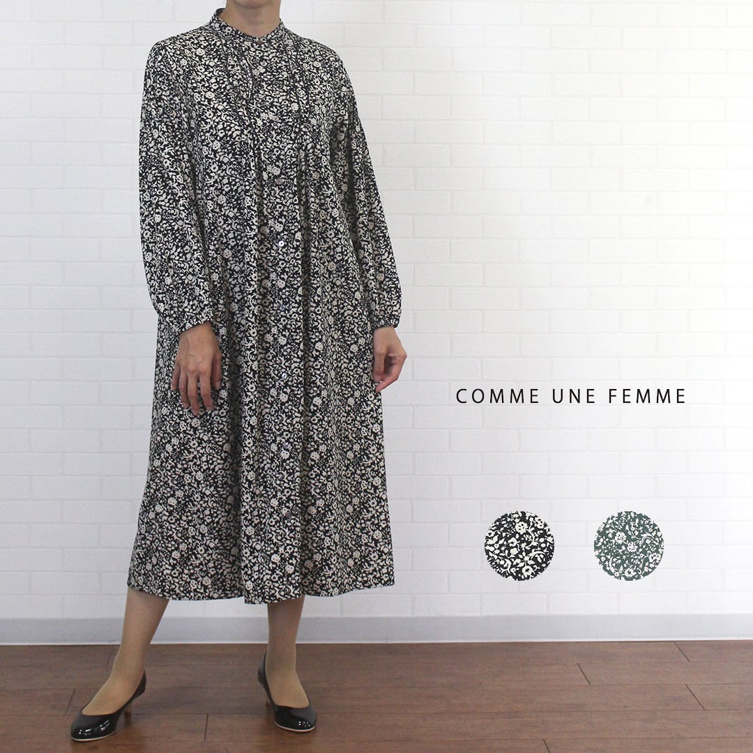 〈洗濯可〉 ワンピース バンドカラー メローフリル 長袖 小花柄 前開き コムアンファム Comme une Femme 40代 50代60代