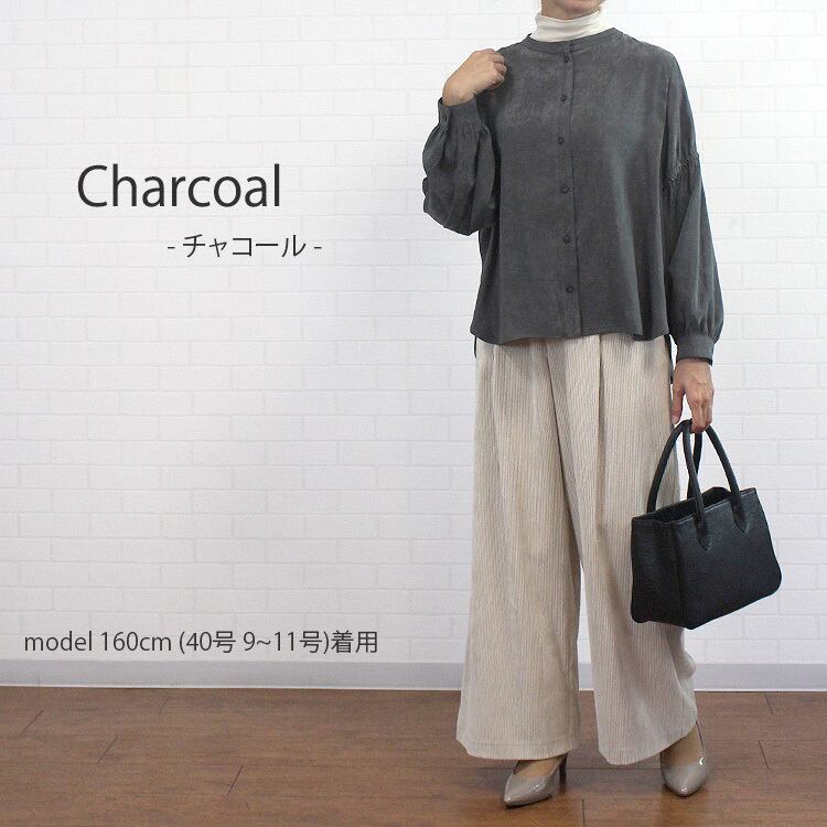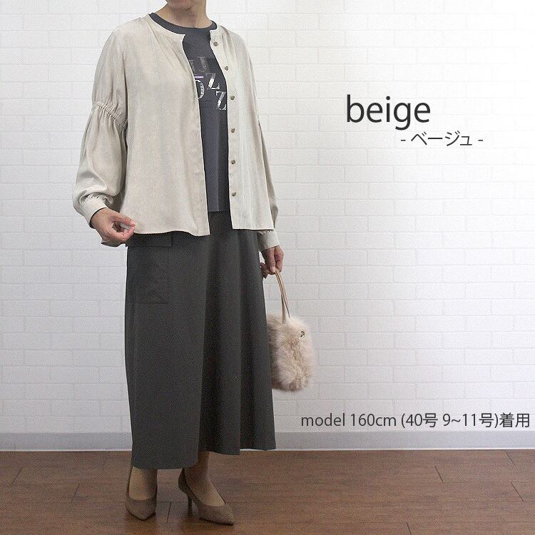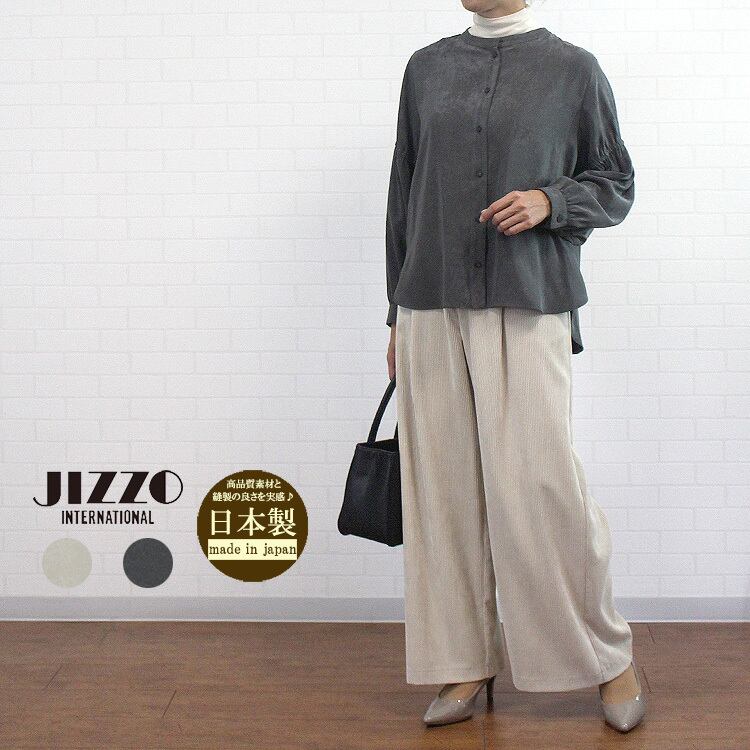 微光沢のあるベロア風生地を使い、シャーリング袖が女性らしいノーカラーブラウス ジッツォ JIZZO ブラウス 前開き 羽織りもの 長袖 日本製 秋 冬 春 レディース 女性 シンプル 前後差着丈 洗濯可 9号 11号 50代 60代 70代