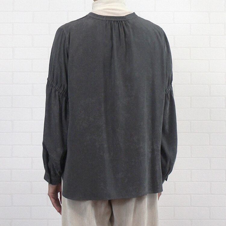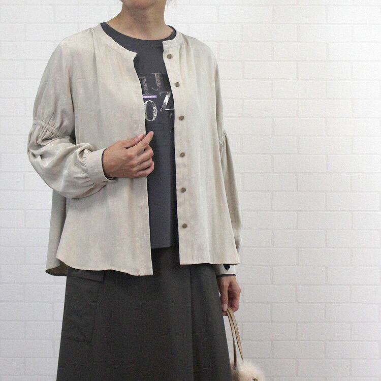 微光沢のあるベロア風生地を使い、お袖のシャーリングが女性らしいノーカラーブラウスがJIZZO/ジッツォから届きました。ふんわりゆったりしたシルエットでパンツにもスカートにもコーデしやすく、秋と春は一枚着で、寒くなってきたらインにTシャツや薄手のニットを着て羽織りにもなる、うれしいブラウスです♪