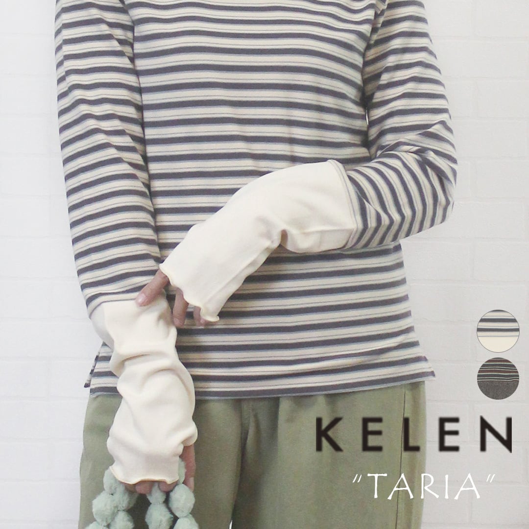指穴つきのロングスリーブが印象的なKELEN(ケレン)の”TARIA”が届きました。肌あたり柔らかく、あたたかみのある素材感は窮屈感なく、ストレスフリーな着心地。カラフルなボーダー地で気分も上がる1枚です。無地の切り替えで長めに設定されたお袖は指穴付き!あたたかさと可愛らしさをプラスしてくれます。1枚ではもちろん、ワンピースやブラウスの下に重ねるだけで可愛く防寒まで叶うアイテムです。