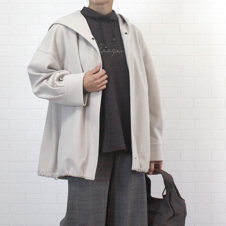 ゆるっとラフに羽織れる、ジッツォ/JIZZOの日本製フード付きショートコート。滑らな肌触りの上質生地は軽くて暖かく、ストレッチ性もあり着心地が抜群!秋の終わりから春先まで、長く羽織れる大人の上質コートです。