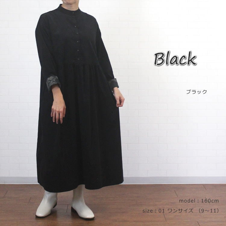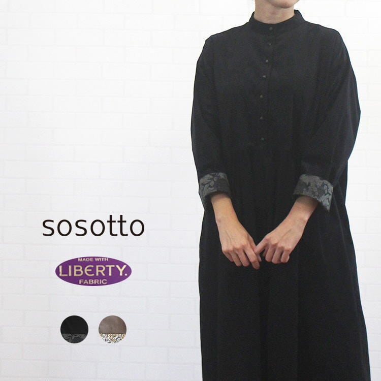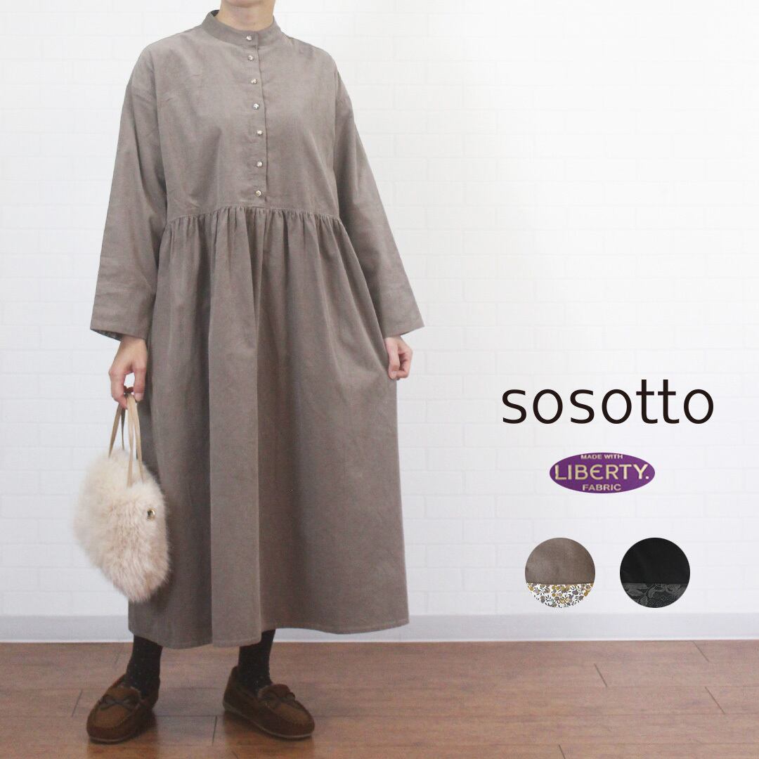 ワンピース 細コール バンドカラー くるみ釦・袖口裏LIBERTY PRINT おしゃれ 清楚 ソソット sosotto 40代 50代 60代
