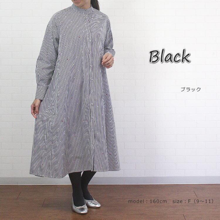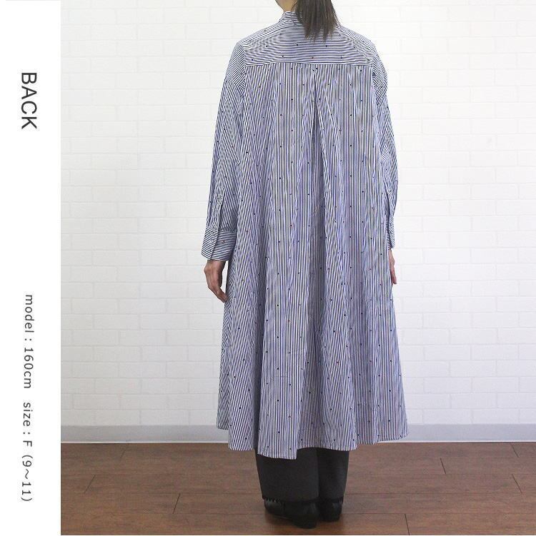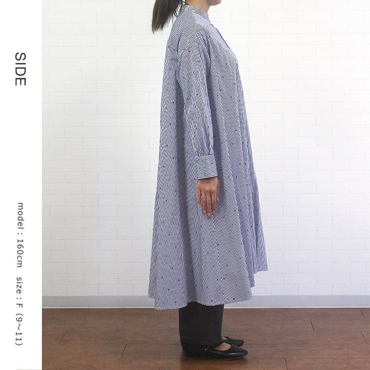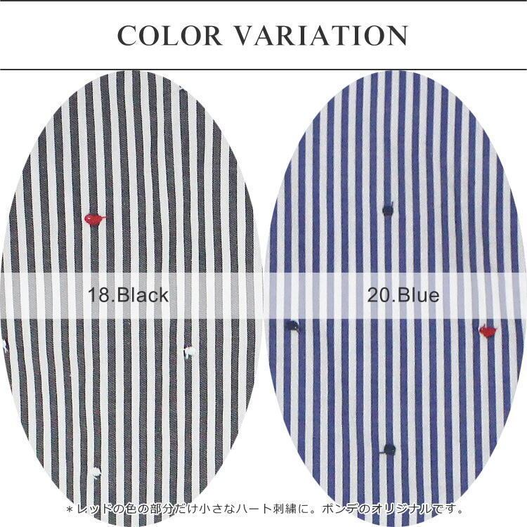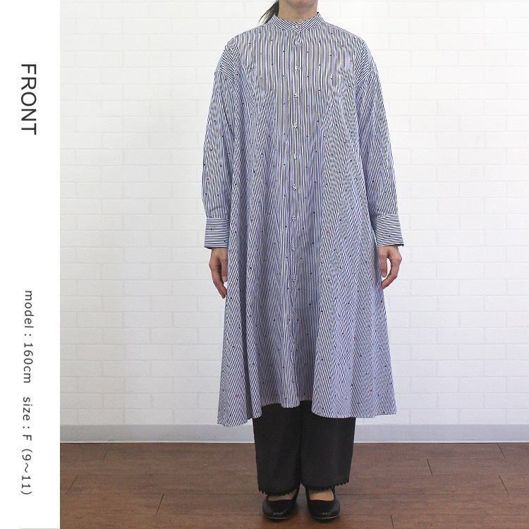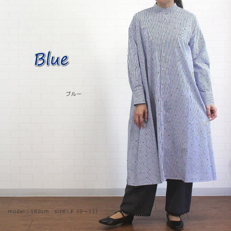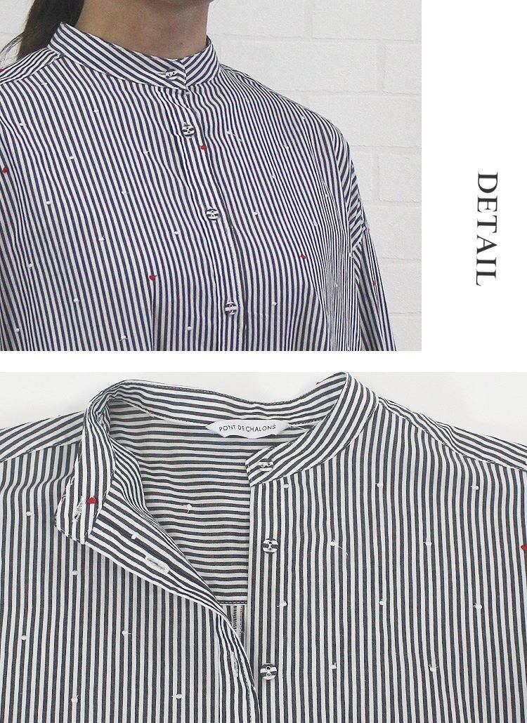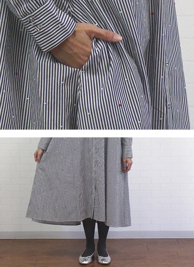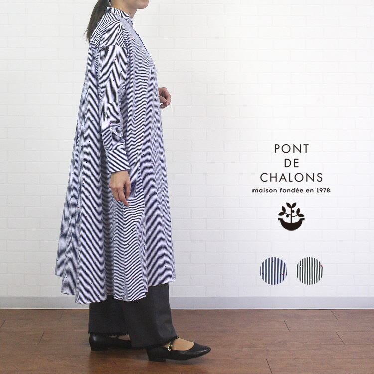 ワンピース ストライプ ドット ハート 刺繍 ゆったり 綿100% バンドカラー 長袖 ポンデシャロン PONT DE CHALONS 40代 50代 60代