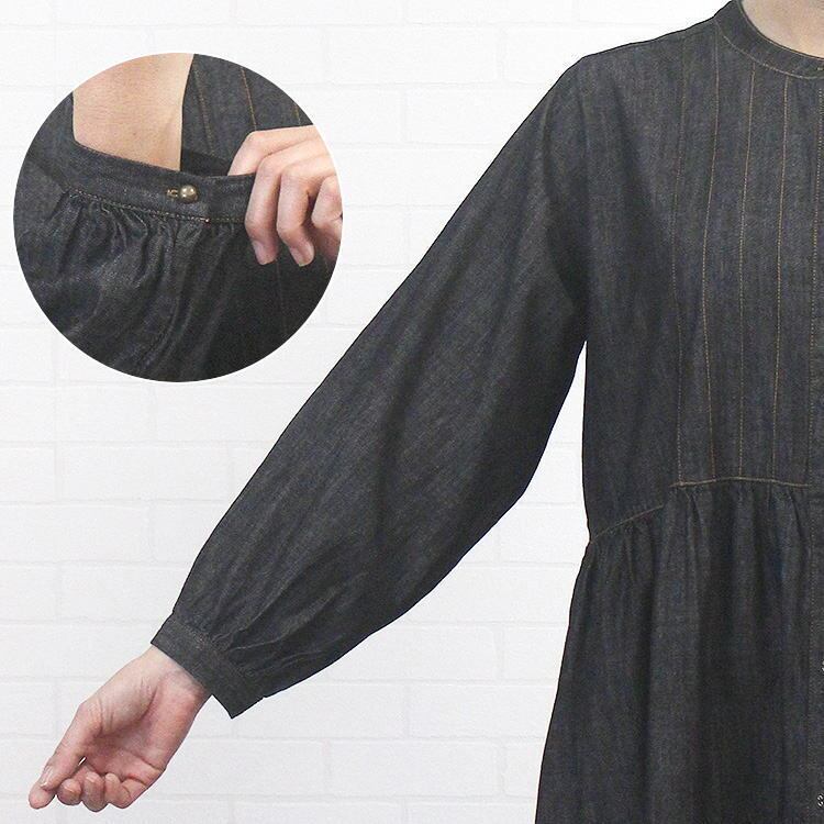 昨年よりも1oz軽い5.5ozの薄手デニムワンピースがsosottoより届きました。ライトオンスのデニムならではのウエスト切り替えギャザーからの落ち感・軽さがあり、一枚着はもちろん羽織としても使いやすいワンピースです。飾りステッチや袖口と第1釦のブロンズのメタルボタンをポイントにしたsosottoらしいさりげないデザインが大人に似合うワンピースです♪