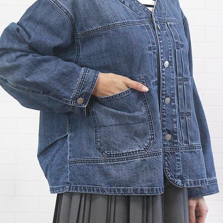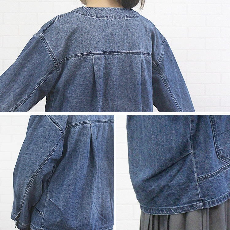 デニムジャケットには珍しいシャープな印象のVネックデザインが新鮮なKELEN(ケレン)の「JEY」。お顔周りをすっきりと見せながら、インナーとのレイヤードスタイルも楽しめます。ゆったり感のあるドロップショルダーに、背面やサイドにタックをプラスし、オーバーサイズながらも立体感のあるシルエットを演出してくれます。フロントのボタンを閉めてきちんと感のあるスタイルもおすすめ。さっと羽織るだけで抜け感のあるカジュアルスタイルが完成する、お洒落度の高いデニムジャケットです♪
