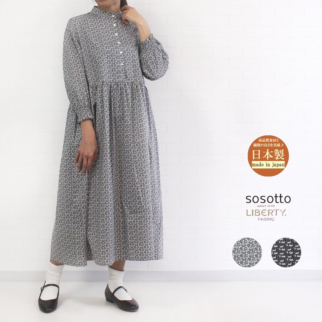 sosotto別注のウサギ柄LIBERTY PRINT 「COTTON TAIL」を使用したワンピース。大人っぽいアールヌーボー調の柄にウサギが描かれた大人っぽさの中に可愛さのある柄です。特別な日にも普段にも、大人の毎日のコーデを華やかに演出してくれるワンピースです♪