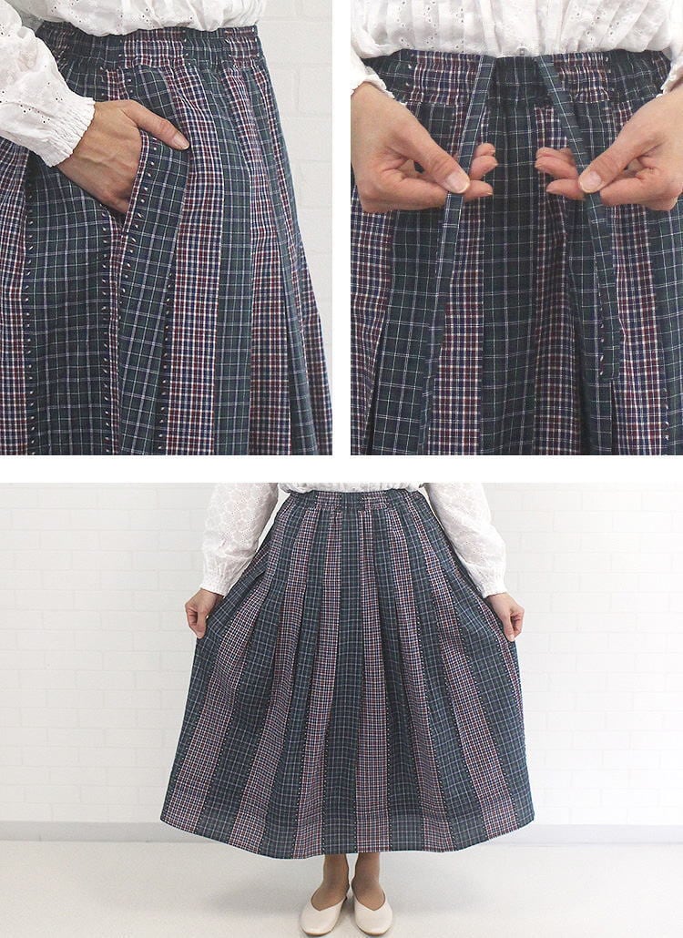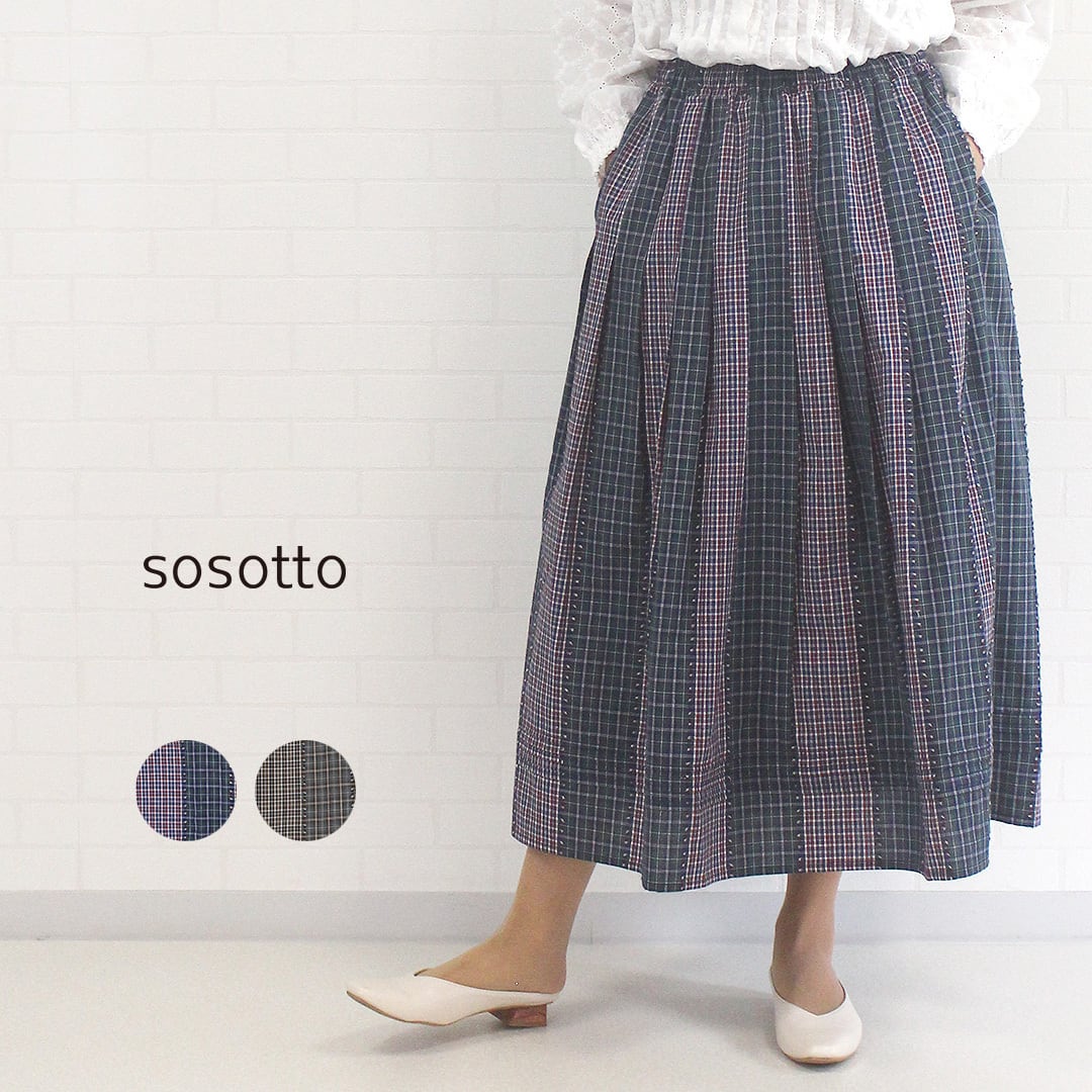 個性的なチェックがステキなギャザースカート ソソット sosotto ボトムス スカート チェック ウエストゴム ドロスト 綿100% 裏地付き 通販 店舗 レディース 女性 春 夏 秋 シンプル カジュアル キレイ 9号 11号 40代 50代 60代