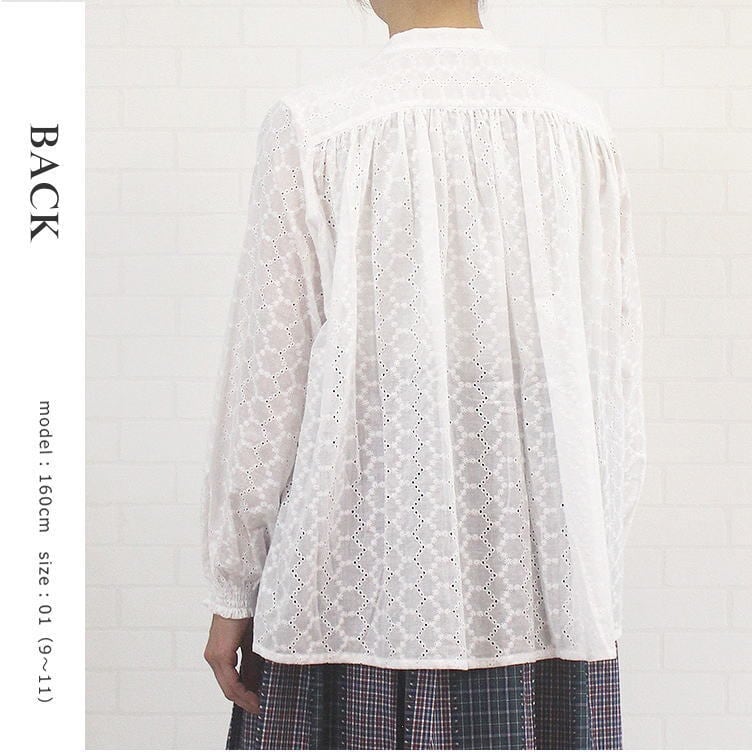 細かな刺繍の入った生地を全面に使用した贅沢なsosottoの刺繍ブラウスのご紹介です。刺繍地とフリルカラー・両肩に入ったピンタックが相まって女性らしさを演出します。前身頃いっぱいに入ったピンタックから広がるゆったりとしたシルエットで、前後差のある長めのチュニック丈がパンツスタイルやボリューミィなスカートとの大人スタイルのコーディネイトに最適なブラウスです♪