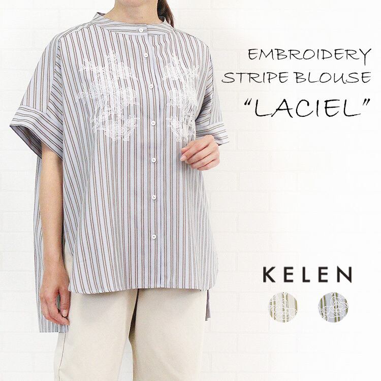 KELEN kelen ケレン LKL26HBL2282 "LACIEL" トップス シャツ ブラウス ストライプ エンブロイダリー 刺繍 フラワーレース 半袖 レディース 女性 服 夏 春 M 9号 11号 大人 カジュアル きれいめ お洒落 ゆったり 店舗 オフベージュ サックス 40代 50代 60代