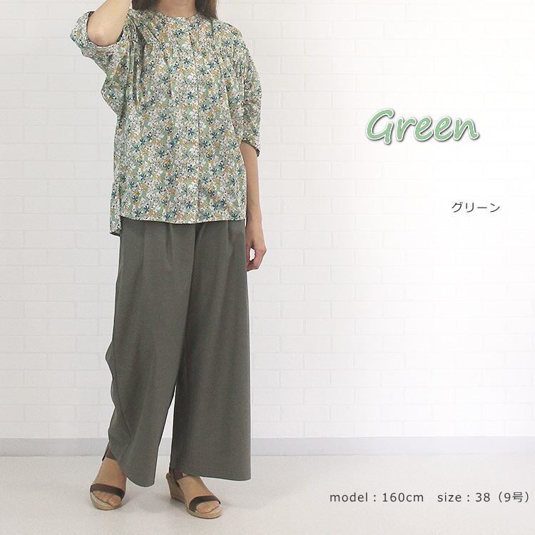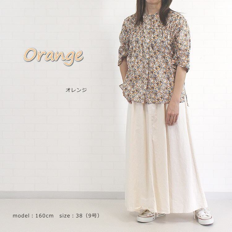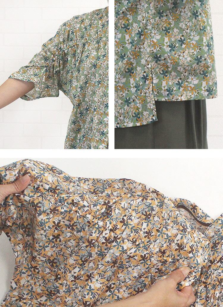 516340 トップス ブラウス 前開き ノーカラー 5分袖 花柄 プリント ギャザー 比翼仕立て 綿100% 通販 店舗 レディース 女性 大人 シンプル 可愛い 春 夏 初秋 洗濯可 38 9号 40代 50代 60代