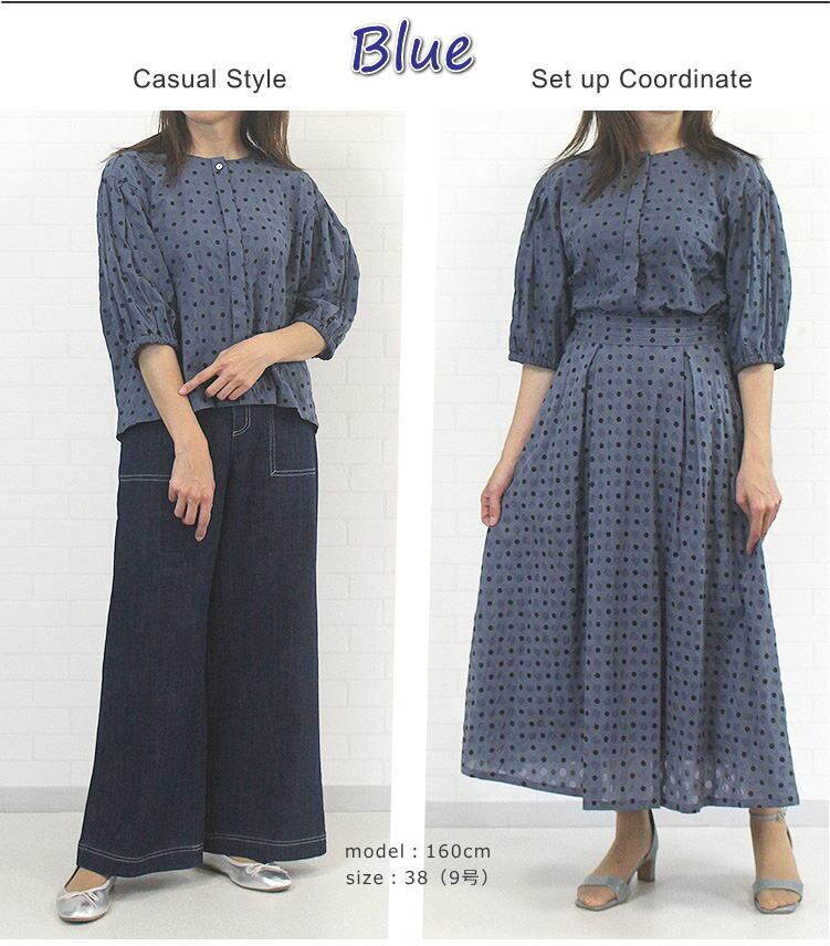 手の込んだ日本製素材が一番のポイントの塩縮ドット柄ブラウスのご紹介です。ふんわりとしたソフトコクーンシルエットがやわらかな印象の前開きブラウスは、526550の同素材スカートとのセットアップも、単品でも目を惹くトップスに仕上がりました♪