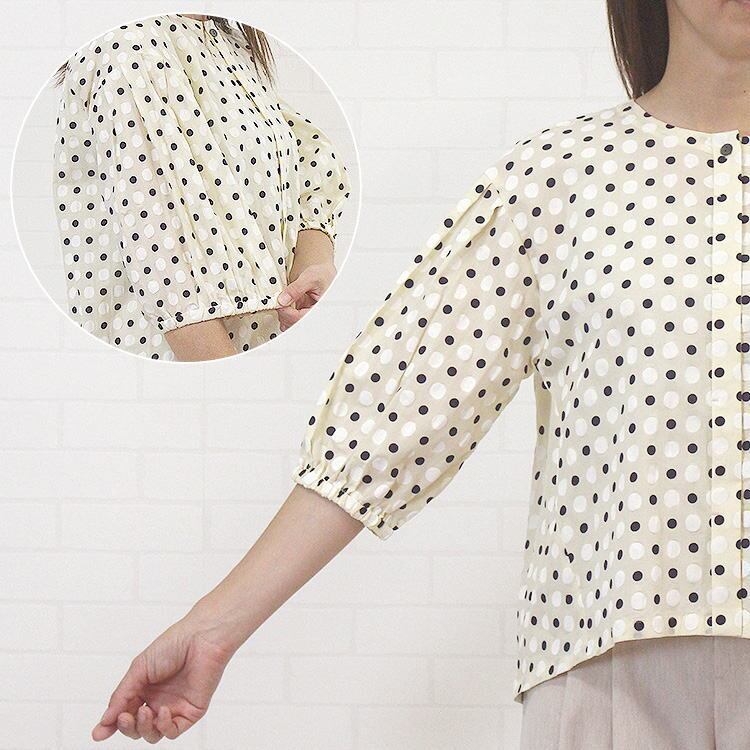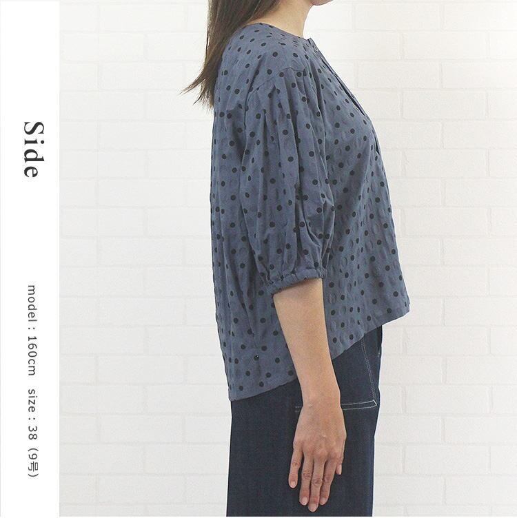 526549 トップス ブラウス 前開き ノーカラー 6分袖 ドット柄 塩縮加工 凹凸 比翼仕立て 綿100% 綿 上質 通販 レディース 女性 シンプル 可愛い 春 夏 初秋 洗濯可 38 9号 40代 50代 60代